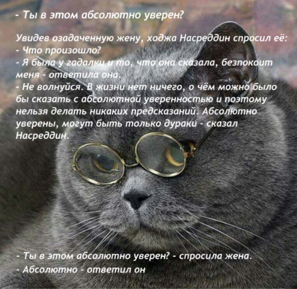 - Не волнуйся. В жизни нет ничего, о чём можно было бы сказать с абсолютной уверенностью и поэтому нельзя делать никаких предсказаний. Абсолютно уверены, могут быть только дураки - сказал Насреддин.