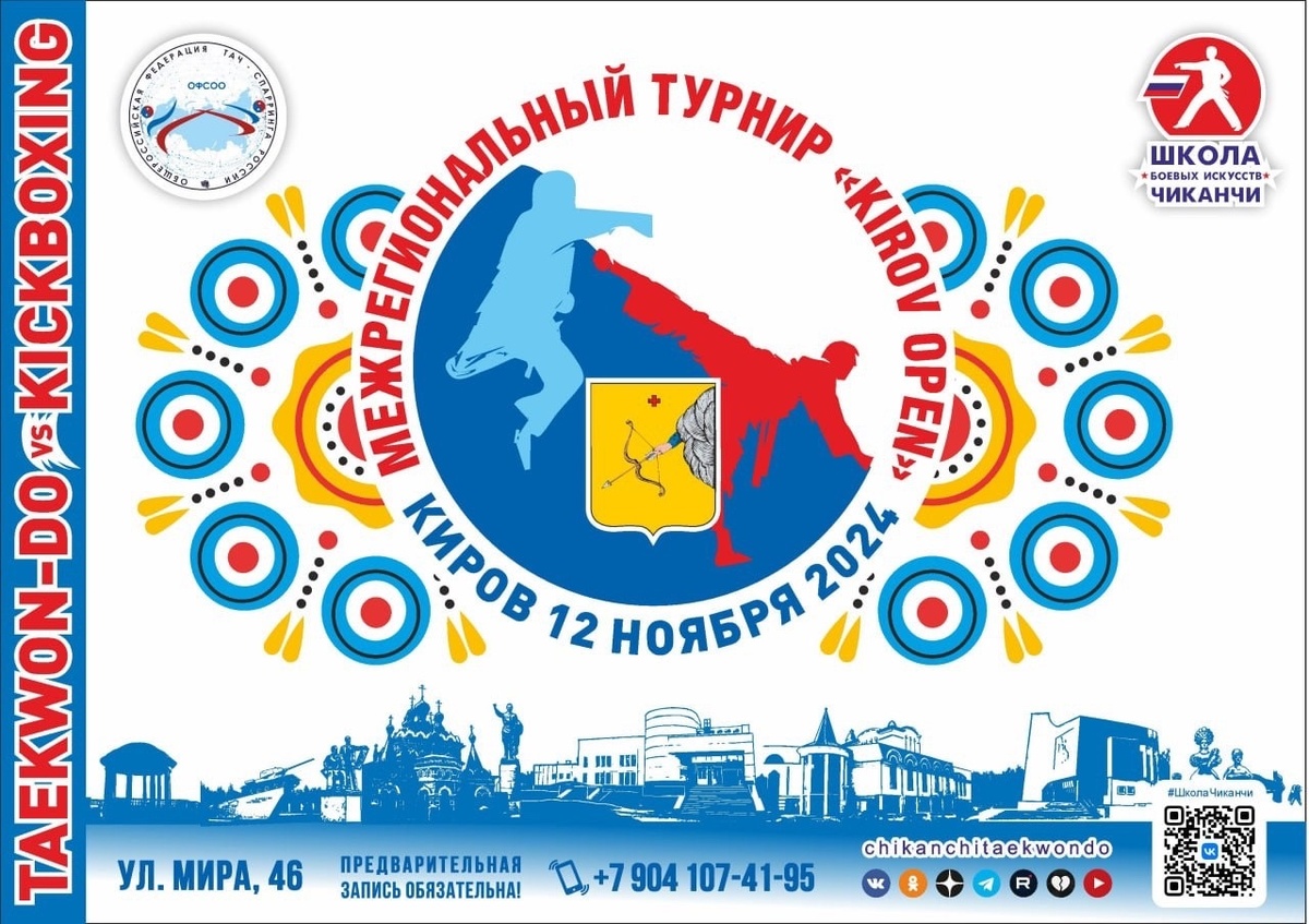 12 ноября в Кирове пройдет ежегодный межрегиональный турнир «KIROV OPEN». Приглашаем всех заинтересованных спортсменов от 3-х лет и старше почувствовать соревновательный дух, окунуться в атмосферу здорового соперничества, стать героями ярких состязаний. Мощный заряд адреналина ждет и родителей, мгновения гордости за своих детей гарантированы. Турнир проводит Школа боевых искусств Анатолия Чиканчи для спортсменов любой федерации тхэквондо. Прием заявок открыт до 8 ноября включительно. 📞 Подробности по телефонам: + 7(912)702-42-30 (для спортсменов школы); +7(904)107-41-95 (для представителей регионов).