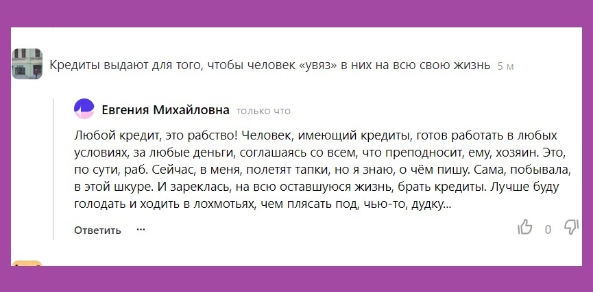 Мне становится жутковато от «исторической» рекламы «кредитов от ВТБ», беспардонно эксплуатирующей нашу литературную классику в жажде наживы. В итоге – наши люди «тонут» в кредитах, поверив циничным банкирам. Которые вешают народу «лапшу на уши», самодовольно объясняя – что «кредиты – это хорошо». Вот только они не уточняют одного момента: Кому на Руси от кредитов «жить хорошо»? «Хорошо» только банкирам, месяц за месяцем браво рапортующим о своих грандиозных прибылях. «Плохо» становится обычному человеку, попавшему к ним в долговую «кабалу». Некоторые попадают пожизненно. А вы знали, что долги по кредитам наследуются? Переходя потомкам. Вот что пишут в комментариях, публикую скрин: Вот что могу сказать по этому поводу: 1) Кредиты – это зло. Самое настоящее «страшное зло». Это словно огнестрельное оружие в руках индейцев. Которые – попав им в руки от «добрых» колонизаторов – буквально выкашивали соседние племена, не обладающие подобным вооружением. И сами потом погибали от одеял с оспой