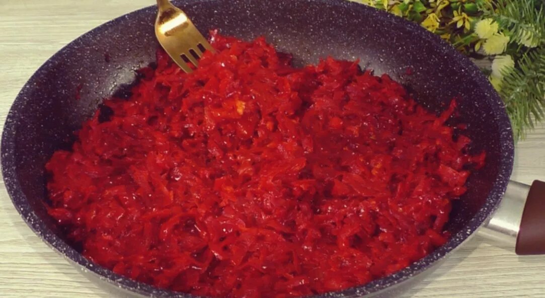 Обжарьте лук до прозрачности на растительном масле на сковороде. Натрите свёклу и морковь на крупной тёрке и добавьте к луку.