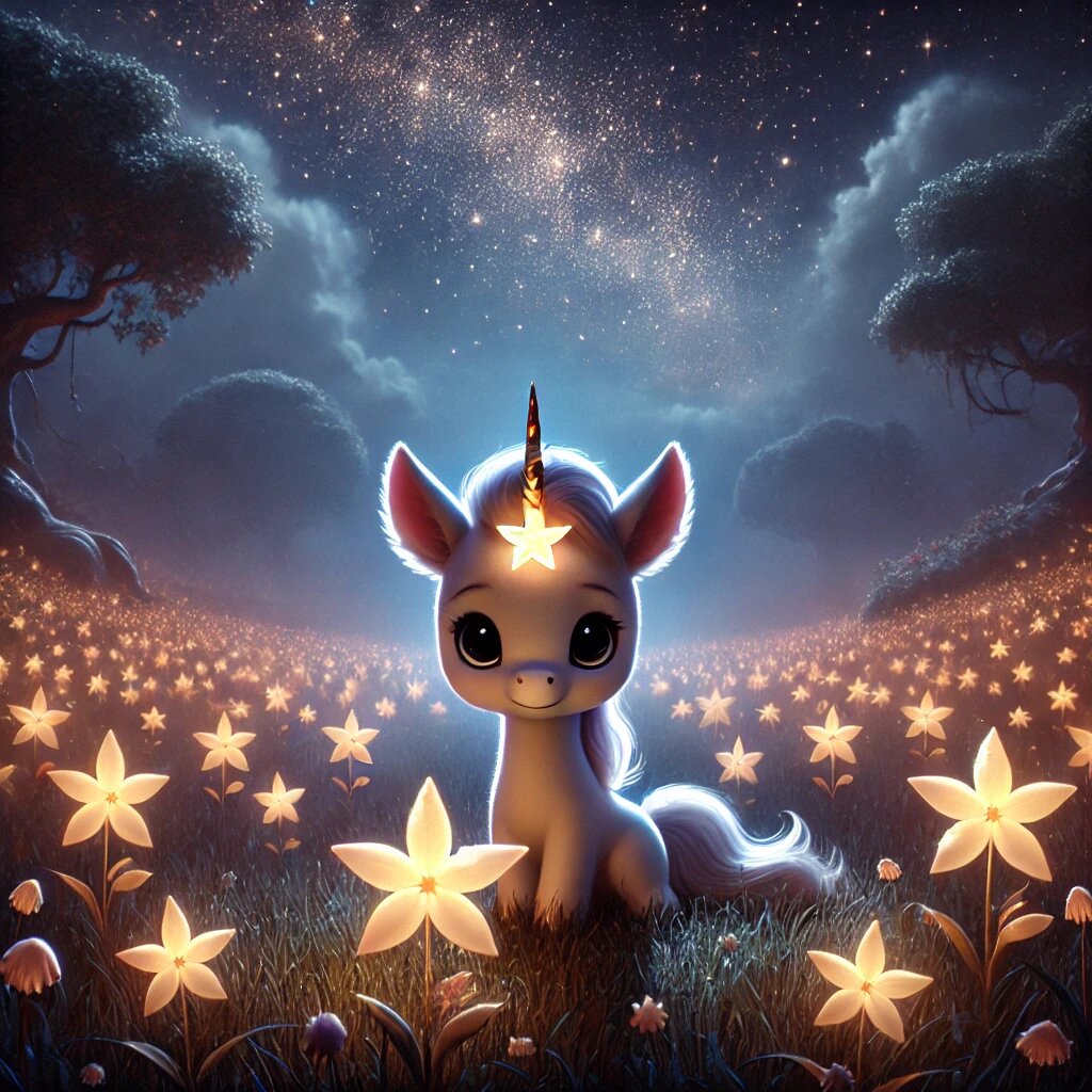 **Сказка о Единорожке Лусии и Звездной Лужайке** 🌌🦄🌟 В далекой стране, скрытой за волшебными лесами, жила-была маленькая единорожка по имени Лусия. Она была не совсем обычным единорогом, ведь вместо обычного рога у нее на лбу сияла звезда, которая светилась, когда она была счастлива. Каждую ночь Лусия любила гулять по Звездной Лужайке — месту, где с неба падали маленькие звезды и превращались в цветы, светящиеся в темноте. Однажды, когда Лусия весело бегала среди звездных цветов, она услышала шепот ветра. Оказалось, что в лужайке поселилась тьма, которая съедала звезды, и с каждым днем их становилось всё меньше. Лусия знала, что если звезды исчезнут, лужайка погрузится во мрак и исчезнет навсегда. Лусия отправилась к старому мудрому совенку, который жил на самой высокой ветке Древнего Дуба. Совенок, узнав о проблеме, нахмурился и сказал: "Тьму может победить только свет сердца, но тебе нужно будет найти его источник." Единорожка долго думала, что же это может значить, и решила пойт
