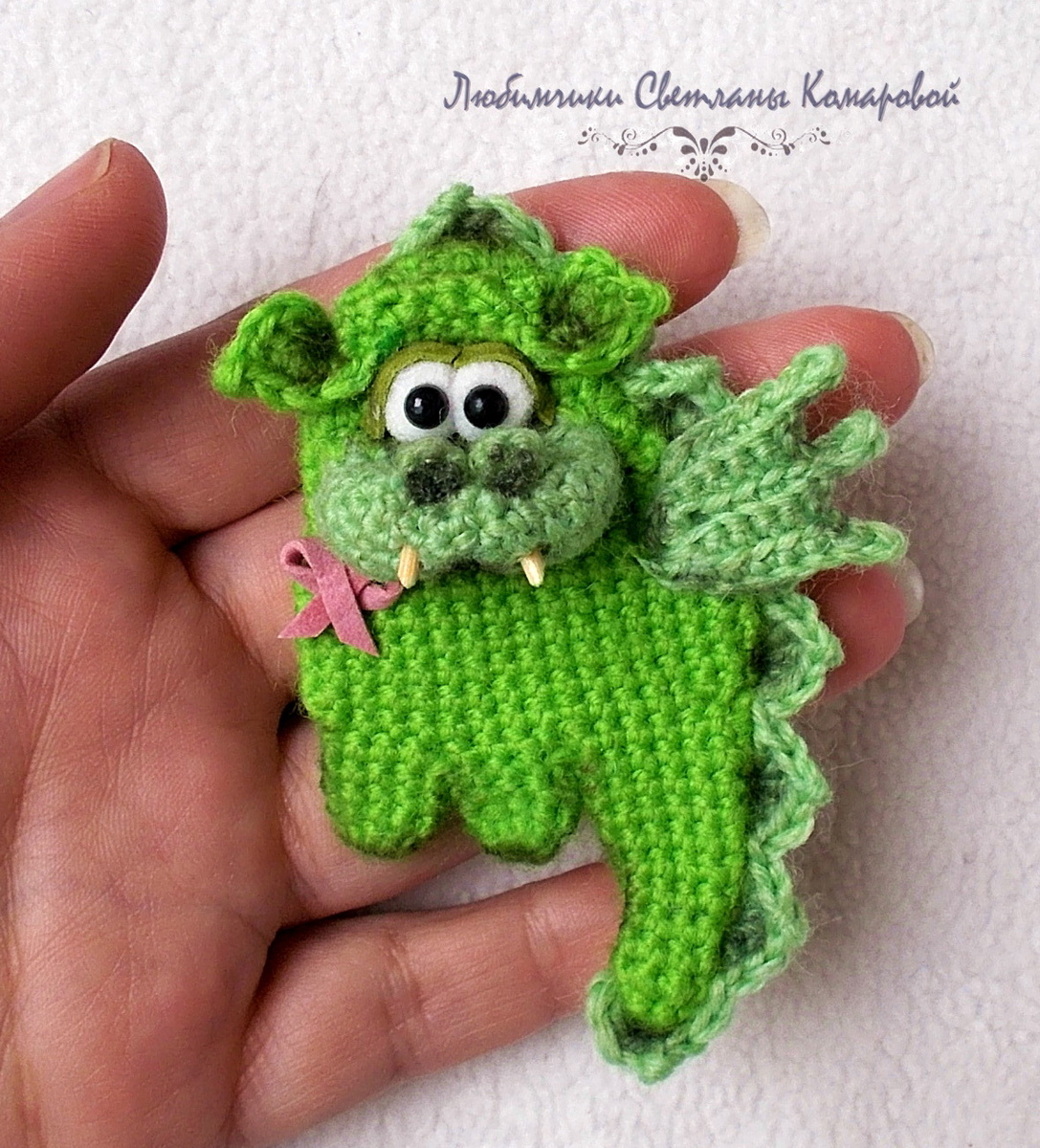 Игрушки по этому описанию могут использоваться по вашему усмотрению, продажа в том числе и по интернету разрешена. указание имени автора описания обязательно. 5 на 8 см. Можно вязать из любых полушерстяных ниток любых цветов, но лучше двух оттенков. Материалы: -Пряжа Пехорка "Детский каприз"(ДК) 50гр, 225м.(у меня два оттенка зелёного) -крючок 1,5мм -крепление для брошей или булавка -нос ширина 1,2см -глаза чёрные полу-бусины 4 мм +шнур для век зелёный+белые помпончики 6мм -тонировка -секундный клей ,украшалки Если не указано иное вяжем сбн по умолчанию и по изнанке/изнутри. -Морда 1шт Св.зел. 2,6 2р-приб(12) 3р-(1,приб)(18) 4р-(2,приб)4раза,1,за одну дл/ст 4,приб,приб,1, за одну дл/ст 4, приб, приб(24 не считая ноздрей) 5,6р-прямо(24) 7р-(2,уб)(18) 8р-прямо(18) Отрезать нить.Ввязывать будем за оба края(9) -Ножки 2шт Зел. 2,8 2,3р-прямо(8) Отрезать нить. Склеить внутри, кроме краёв . -Хвост 1шт Зел. 2,6 2р-прямо(6) 3р-5,приб(7) 4р-6,приб(8) 5р-7,приб(9) 6р-8,при