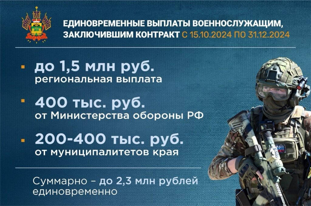 Постановление губернатор Кубани уже подписал. В итоге теперь контрактники от Краснодарского края могут получить до 2,3 млн рублей. Вениамин Кондратьев: «Приняли решение увеличить единовременную выплату от Краснодарского края военнослужащим, заключившим контракт с Минобороны РФ. С 15 октября она составит 1 млн 500 тыс. рублей. С учетом выплат от Министерства обороны РФ и муниципалитетов общая сумма может достигать 2 млн 300 тыс. рублей. Сохраняем также все меры поддержки семей военнослужащих. Забота о них – в приоритете». Указом Президента России с 1 августа была увеличена сумма федеральной выплаты тем, кто заключил контракт на военную службу на 1 год и более, до 400 тыс. рублей. Муниципалитеты Краснодарского края единовременно выплачивают от 200 до 400 тыс. рублей. Претендовать на получение выплат могут участники спецоперации, направленные в военные части с территории региона и заключившие контракт с Минобороны, а также отобранные военкоматом Краснодарского края в ЛНР, ДНР, Запорожской