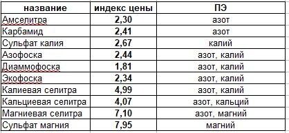Как видно, ассортимент ну очень большой, кроме микроэлементов. На чём остановить свой выбор? Нам поможет в этом как раз индекс цены 1% питательного элемента в 1 кг удобрения. Результаты свел в таблицу. Чем ниже индекс, тем дешевле нам будет стоить наш урожай. Фосфор исключен из расчёта по причине того, что основное удобрение для наших 6-ти соток-комплексное, где его всегда содержится в избытке.