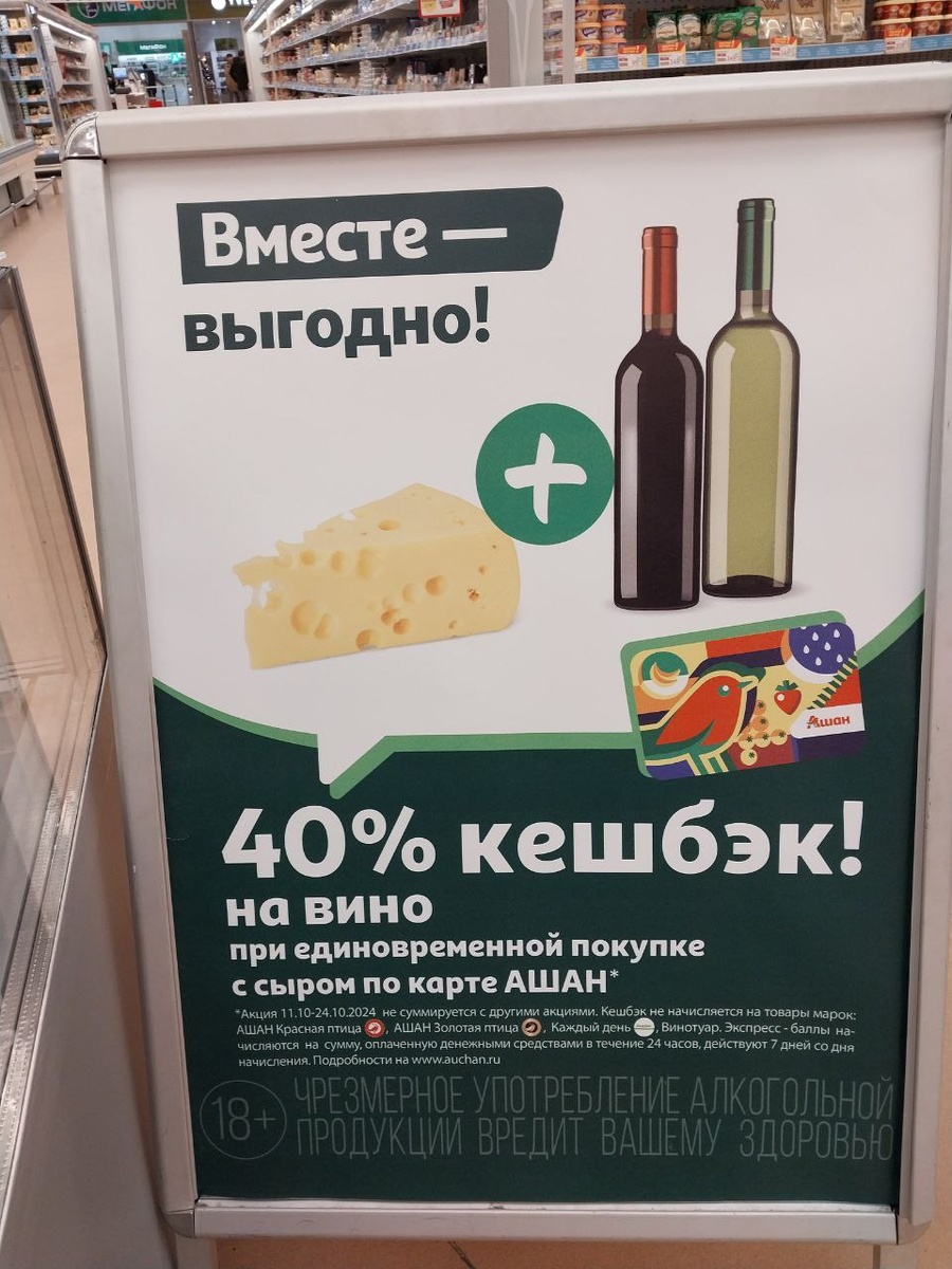 Зашёл в "Ашан" без намерения взять бухла, но пришлось! Что же они делают, изверги! :D Вы помните, что обычно в обзорах я нахожу, за что поругать эту сеть, но в данном конкретном случае могу поругать только за то, что вы сможете прочитать в самом конце статьи. :P А положительно хочу отметить за акцию со скидкой 40% на вино при покупке сыра: