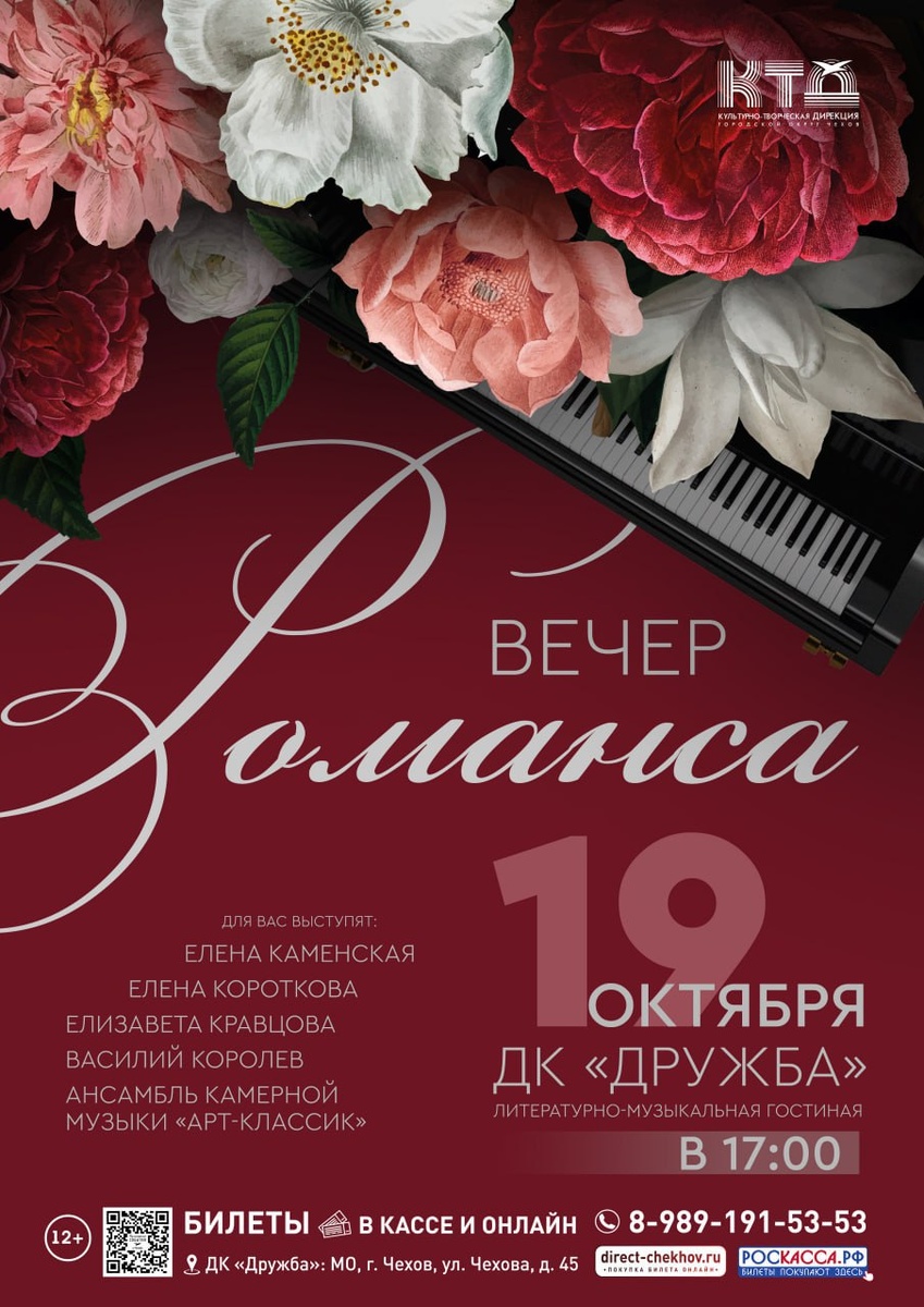 💥 Дорогие друзья! Приглашаем вас на встречу с Романсом в литературно-музыкальную гостиную ДК "Дружба" г. Чехов Русский романс полон очарования и светлой грусти. Встреча с ним всегда приятна и желанна, и этот вечер предоставит всем возможность услышать лучшие романсы великих русских композиторов и поэтов.💗 Романс неисчерпаем и многообразен также, как и чувства, из которых он рождается и расцветает. В программе выступят артисты ❗❗❗ В.Королев, Е.Короткова, Е.Каменская, Е.Кравцова и ансамбль камерной музыки «Арт-классик». 🎼 Ждем вас на наш творческий вечер! 🚫 Возраст: 12+ 📆 19.10.2024 🕕 17:00 🏢 ДК «Дружба» 📍 г. Чехов, ул. Чехова, д.45 💰 Цена: 300 ₽ 🎫 Купить билет: https://clck.ru/3Db2mJ