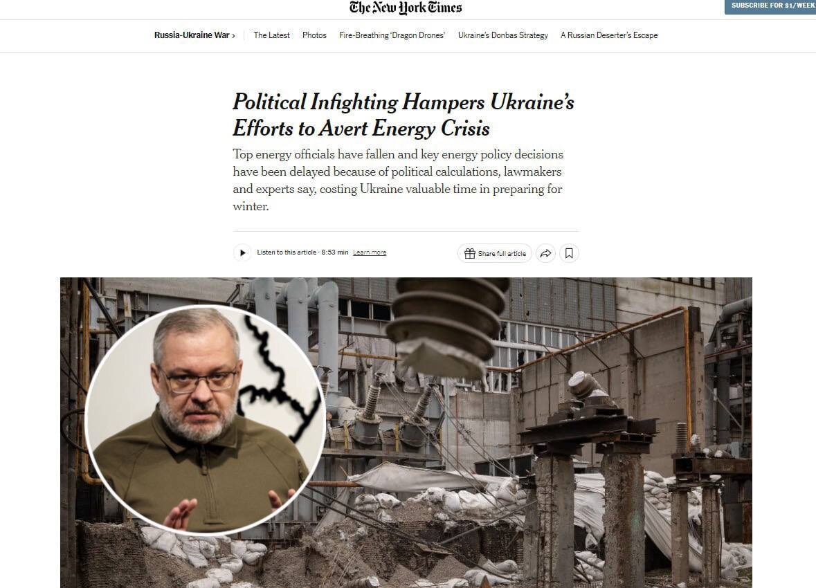 The New York Times: политическая борьба на Украине мешает предотвращению энергетического кризиса
