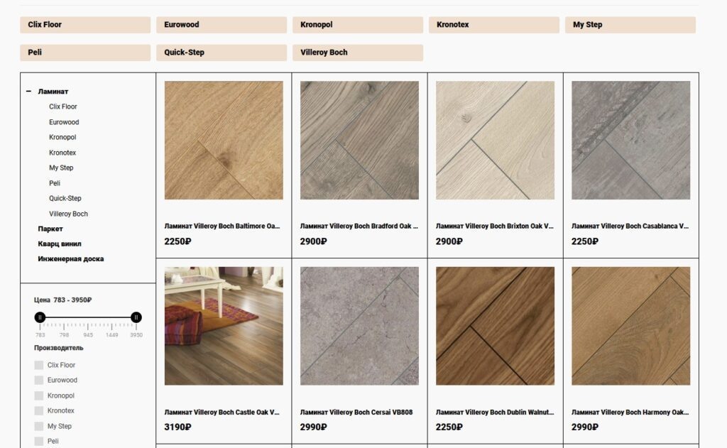 - Устаревшие цены и отсутствие синхронизации с системой складского учета — в ходе работ выяснилось, что цены на сайте были неактуальными, а система складского учета клиента не была синхронизирована с сайтом. Стандартные решения для экспорта и импорта товаров не подходили, так как требовалось менять несколько показателей одновременно (например, цену за квадратный метр, цену за упаковку и количество в квадратных метрах).