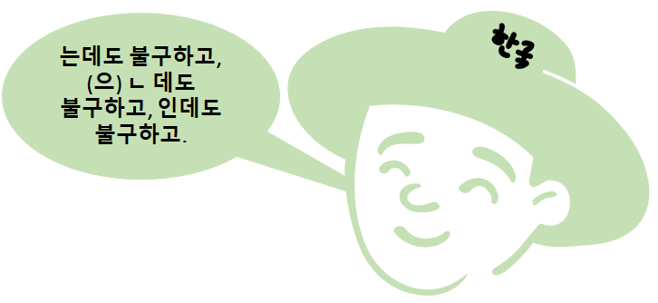 (настоящее время) 한국어 시험이 어려운데도 불구하고 시험을 잘 봤어요. Несмотря на то, что тест по корейскому языку был трудным, я справился с ним хорошо.