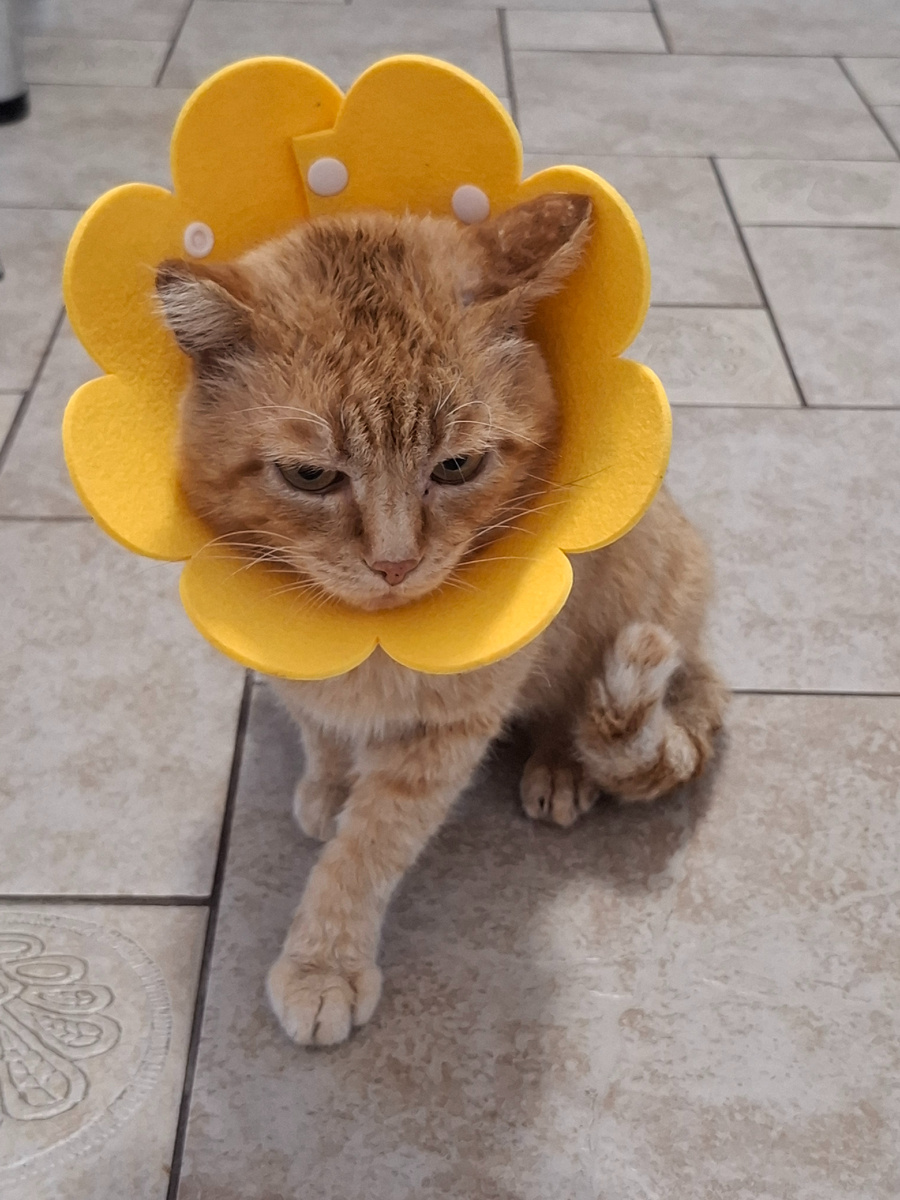 Приветствую читающих. Вот это у меня цветочек экзотический появился! Не, это я не шучу, это Васеньку лечу. Спина вся облезла, мазала мазью, все слизал, еще больше вылизал раны. Ветеринарного пункта нет, и в аптеке не нашлось ветеринарного воротника, пока с ВБ ждала что только не придумала. Серый обычный воротник не захотела коту , приобрела такой мягкий, фетровый цветочек, точно подсолнух и к шкурке подходит. Это он от неожиданности сидит такой печальный, не знает как себя вести. Освоился потом. А когда вылизывал мазь, что только я не придумывала. Забинтовала - все свернул, потом бинт поверх натянула, все равно бесполезно. Как себя этот воротник покажет. Есть он в нем не смог, пришлось снять и караулить пока поест, а потом сразу одеть, потому как опять начал не отходя от миски раны свои лизать. Я пошла на прогулку и он тоже на окно глянуть на улицу. Погода сегодня совсем не середины октября, тем более Покров был вчера. Солнце яркое,+10. Небывалое явление. Не могу пройти