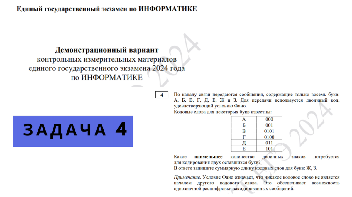 Условие задачи: "По каналу связи передаются сообщения, содержащие только восемь букв: А, Б, В, Г, Д, Е, Ж и З. Для передачи используется двоичный код, удовлетворяющий условию Фано. Кодовые слова для некоторых букв известны: А 000 Б 001 В 0101 Г 0100 Д 011 Е 101 Какое наименьшее количество двоичных знаков потребуется для кодирования двух оставшихся букв? В ответе запишите суммарную длину кодовых слов для букв: Ж, З. Примечание. Условие Фано означает, что никакое кодовое слово не является началом другого кодового слова. Это обеспечивает возможность однозначной расшифровки закодированных сообщений."