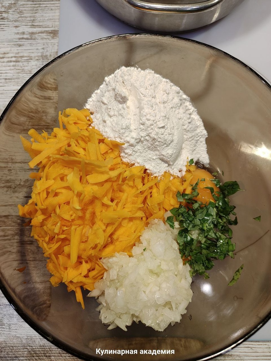 Всем привет! Сегодня мы будем готовить драники — вкусное и несложное в приготовлении блюдо. Подготавливаем все ингредиенты. Очищаем тыкву и натираем её на крупной тёрке. Репчатый лук можно мелко нарезать или, как это сделала я, измельчить в блендере. Добавляем яйцо и зелень на ваш выбор. Несколько столовых ложек муки. В этот день у меня не нашлось ничего, кроме базилика, поэтому я использовала его. В результате получилось очень необычный вкус блюда. Смешайте все ингредиенты и обжарьте на сковороде с небольшим количеством растительного масла с двух сторон. Подавайте блюдо горячим, со сметаной. Обязательно попробуйте приготовить тыквенный крем-суп. Подписывайтесь на канал, будем готовить вместе!