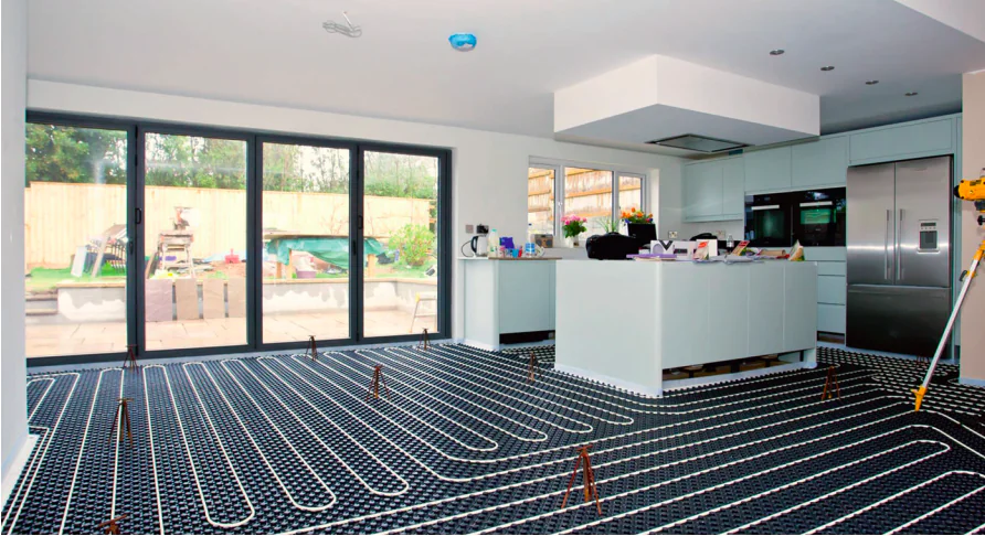 Водяной тёплый пол — система напольного отопления, позволяющая равномерно распределять тепло по всему объёму помещения. Она исключает образование холодных областей и не пересушивает воздух, создавая комфортные условия для нахождения и проживания людей. Эффективность технологии достигается благодаря температуре теплоносителя — она ниже, чем в стандартных радиаторах. Правильный монтаж системы обеспечивает её надёжность и долговечность. С чего начинается укладка водяного тёплого пола, из каких рабочих этапов она состоит, какие требования предъявляются к напольному отоплению? Об этом — в предлагаемой статье. Требования к системе водяного тёплого пола Монтаж водяного тёплого пола осуществляется согласно СП 60.13330.2020 [1]. В нём прописаны основные температурные требования. Если напольное отопление укладывается в помещении, где люди пребывают постоянно (более двух часов), то температура поверхности пола должна быть 26°C. При укладке на объекте с временным пребыванием людей — 31°C. Перепад