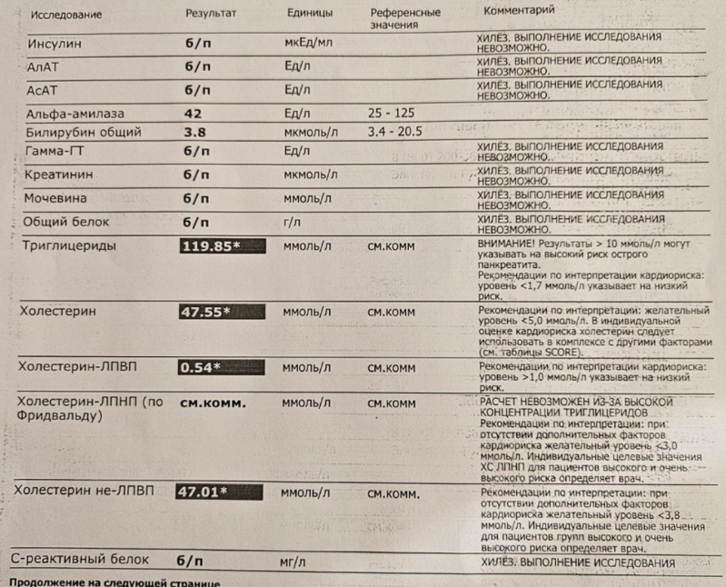 Сегодня вернулся из командировки в один из регионов, где мы проводим выездной цикл по терапии (внутренние болезни). Обучаем врачей - терапевтов, кардиологов. После лекции по нарушениям липидного обмена ко мне подошла врач-терапевт, чтобы посоветоваться насчет своего пациента. И продемонстрировала мне его лабораторные анализы. Последние лет пять я углубился в липидологию (раздел кардиологии о нарушениях обмена липидов и атеросклерозе). И конечно, за эти пять лет я перевидал разных тяжелых пациентов с этой патологией, каких я не встречал за предыдущие годы работы. Просто потому, что теперь пациенты с тяжелыми нарушениями липидного обмена концентрируются у меня. Итак, что же там было? Приведу скриншот, а то не поверите). Здесь такой хилёз плазмы, что кроме триглицеридов и холестерина, больше ничего измерить не удалось. Это частое явление у тех, у кого кровь похожа на молоко из-за плавающих в ней в огромных концентрациях жиров (триглицеридов). Они должны служить топливом для мышц, однако