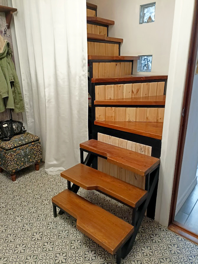 Конечно, планировалась нормальная 2-х маршевая. Но пока мы строили изменились требования к газовым котельным, и готовую коробку дома пришлось перепланировать под требуемых 15 кубов. А это отрезать от полезной площади почти 6 квадратов! Пришлось уменьшить ванную и кухню, а лестницу перенести ближе ко входу и урезать по минимуму. Вышла она 1-но маршевая с тремя забежными и тремя поворотными ступенями. Когда заказывали металлический каркас для нее, замерщики сказали, что будет неудобная. Ширина всего 75 см., длина 2 м., 13 ступеней, 14 подступенков высотой 21 см. Нашла решение в интернете - утиный шаг. Это когда ступень делают разной ширины. В нашем случае получилось - широкая часть 26 см, узкая - 19 см. Это повышает комфортность таких неудобных лестниц. Поскольку ступенек вышло нечетное количество, есть минус - надо всегда начинать движение с определенной ноги. Снизу заходим с правой, а спускаемся с левой. Но это тоже дело привычки. Не стандартные размеры нас не смущают. Муж почти п