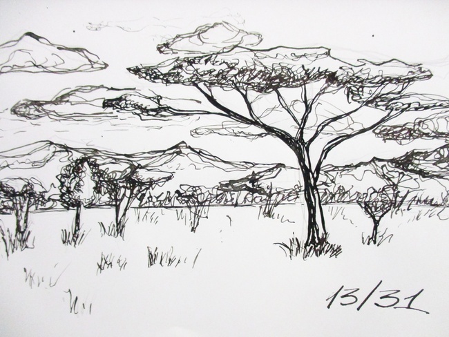 "Утром в дикой природе царила безмятежность, облака плыли по небу, как корабли по океану. Легкий ветерок обдувал и немного раскачивал деревья, растительность, траву.