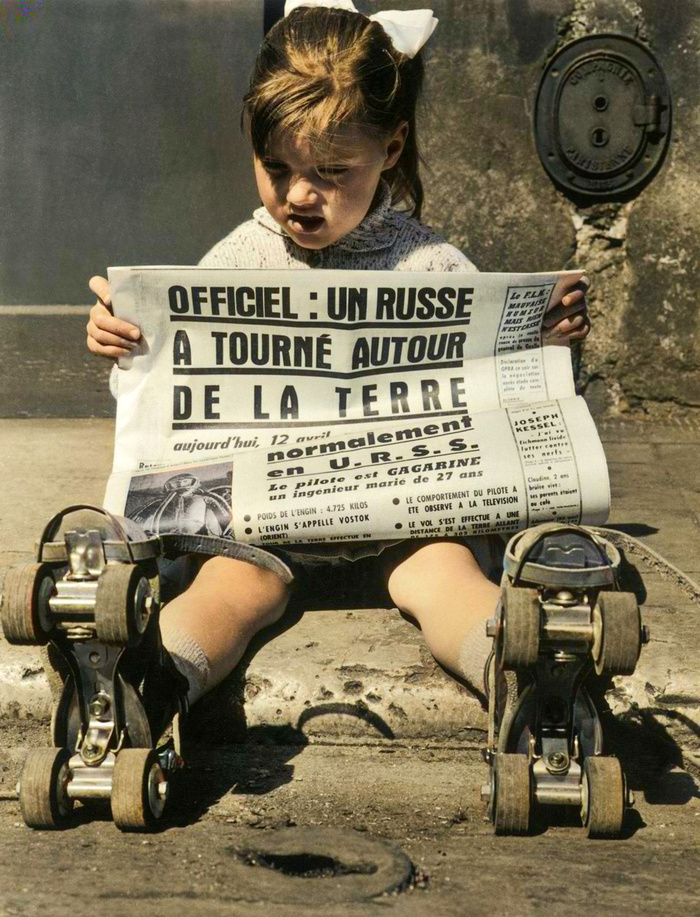 Маленькая парижанка читает новость о Юрии Гагарине: Человек в космосе. 12 апреля 1961 года Юрий Гагарин вылетел с космодрома Байконур на борту космического корабля «Восток-1» для первого полета человека в космос, Париж, Франция, 1961 год. Район Тримли, Цюрих. Швейцария, 1981-84 год. Может сложиться впечатление, что эта горка находится в одном из городов на постсоветском пространстве. Схожие панельки есть практически везде. На берегу реки Елстра в Ферде. Норвегия, 1915 год. Люди не меняются: сейчас такие же компании на пикнике открывают двери авто и музыку на всю громкость включают, или ходят с переносными колонками. Молодые фермеры в Вестервальде, Германия, 1914 год. 93-Летняя Мадам Мерсье. Парижский дворник, 1920-е. Женщина и девочка, спрятавшиеся за воздушными шарами. Париж, 1949 год. Шары приближенные к современным были созданы Д.Г.Инграмом в 1847 году в Лондоне. Для надувания использовали водород – взрывоопасный газ. Голландская семья спасается на своей крыше во время большого наво