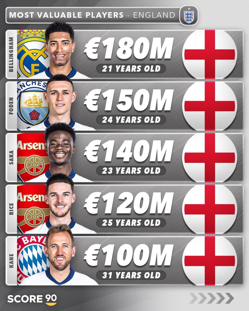 Transfermarkt обновил стоимость игроков из европейских чемпионатов. На основе новой информации портал Score 90 составил рейтинги самых дорогостоящих игроков из 13-ти европейских сборных. Англия Беллингем стал самым дорогим футболистом англичан, а в Ла Лиге Джуд по трансферной стоимости уступает лишь своему одноклубнику – Винисиусу, чья стоимость после обновления оценивается в 200 млн евро. Испания После обновления трансферная стоимость Ламина Ямаля выросла на 30 млн евро. Юноша вошел в десятку самых дорогих игроков современности. Франция У «синих» топ-3 самый дорогостоящий футболистов занимают представители «Мадрида». Мбаппе в Ла Лиге делит с Беллингемом второе место в рейтинге самых дорогих игроков чемпионата. Германия Флориан Виртц и Джамал Мусиала разделили первую строчку топа. В рейтинг стремительно ворвался Александар Павлович – рыночная стоимость воспитанника «Баварии» выросла на 30 млн евро. Италия Самые дорогие футболисты «адзурри» – представители «Интера». Калафьори и Удоджи р