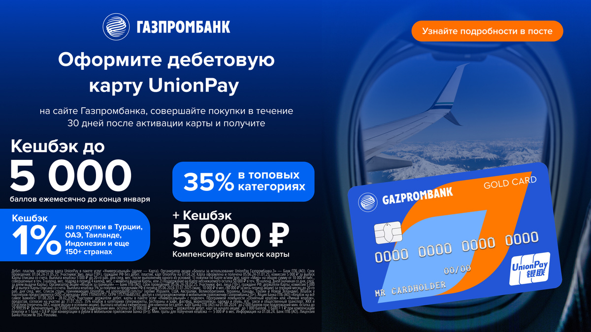 Оформите дебетовую карту UnionPay от Газпромбанка по уникальной ссылке, совершайте покупки по этой карте или по доп.карте "Мир" от 10000 ₽ каждый месяц в течение 3 месяцев подряд, ИЛИ поддерживайте на карте неснижаемый остаток 50000 ₽ в первые 90 дней и получите кешбэк 5000 ₽. Кешбэком можно компенсировать комиссию 5000 ₽ за выпуск карты!