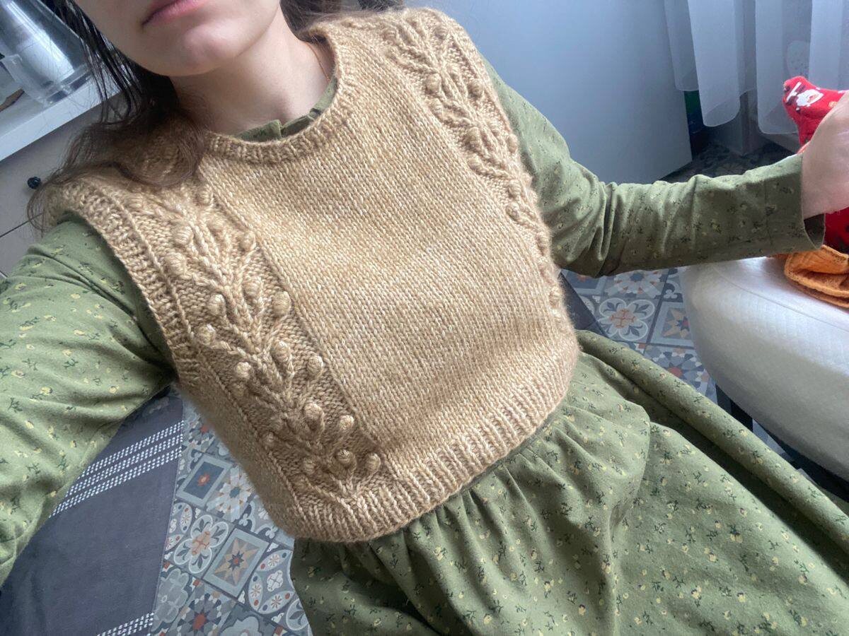 Когда связала этот жилет на своем Ютуб канале, очень много было откликов на то, чтобы сделать по нему мк. И спасибо за комплименты отдельно. ❤️ Но в связи с тем, что у меня не так много опыта в вязании: я смогла только сделать описание. И предлагаю его Вам: Пряжа Фиджи из Троицка 124 цвет песочный. Состав: мерин.шерсть 20%, акрил 20%, хлопок 60%.50г/95м. Внимание! Это не подробное объяснение, но что смогла то вспомнила. Вязала очень давно и есть вероятность, что где-то по петлям может не сойтись. Перепроверяйте себя, пожалуйста, и слепо не вяжите.💕 Мой размер российский 44. Рассчитывала на ОГ 92 см+3 см свобода облегания, итого 95. ДИ 42 см всего. Плотность: 1,6 петель на 3,2 ряда Узор номер 129 в книге Хитоми Шида 260 японских узоров (вероятно этот узор можно найти в свободном доступе). Узор состоит из 16 петель. Узор только по переду и на 84 петлях его распределила так: 10 п лицевые, 16 петель узор, 32п лицевые центральные, 16 петель узор, 10п лицевые. Вязание начинается