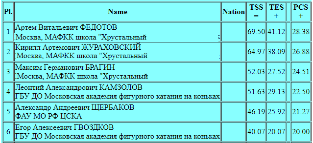 Артем Федотов (69.50 - 1 место) готовится в следующем сезоне перейти на юниорский уровень и сейчас работает над стабильностью тройного акселя, ведь обычные тройные прыжки он уже в прошлом сезоне исполнял практически без ошибок. Здесь турнир проходит по правилам 1 сп. разряда, так что в короткой программе свой тройной аксель Артем должен был исполнить в каскаде с тройным тулупом, с чем справился великолепно, добавив также сольные двойной аксель и тройной лутц. Новая короткая программа Артема поставлена под композицию группы "The Doors" "Пять к одному". Динамично, артистично, по хорошему агрессивно и дерзко, точно в музыку. Примерно такие же характеристики получали от меня выступления 12-летнего Арсения Федотова, а теперь по его стопам идет младший брат Артем.