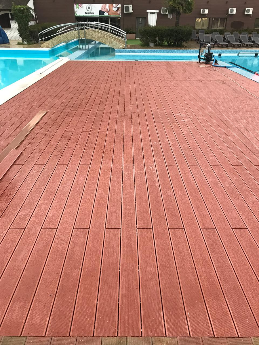А ещё, для того, чтобы сделать ровный такой шов, даже на момент монтажа, нужна квалифицированная бригада, которая идеально по шине отпилит доску и идеально её смонтирует данный способ мы рассматривать не будем. Почти все террасы укладываются от отбежки швов. Либо с изготовлением доски в полную длину, например, 5 метров.