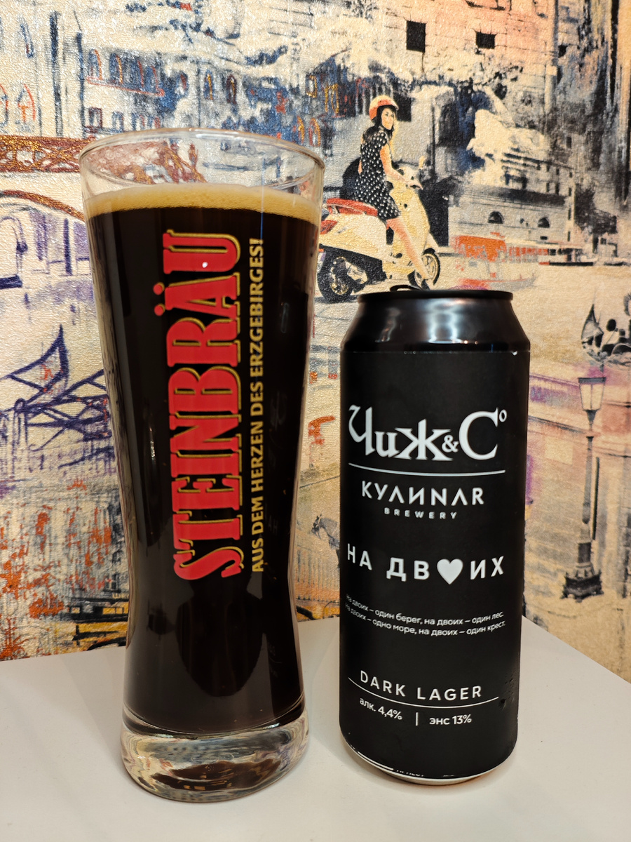 КУЛИNAR brewery, как я понимаю, в бОльшей степени знаменита своими пивными пирогами и десертами - я подобное не люблю. А вот мимо тёмного лагера пройти не смог. Пиво сварено в коллабе с группой Чиж&Со - так подумал я. Название напитка повторяет название одноимённой песни этой группы. Не являюсь большим поклонником их творчества. А вот тёмное пиво - люблю. Оказывается Чиж&Со это ещё и контрактная пивоварня; пиво На двоих - записано в их копилку, а не КУЛИNARов. Кстати, всё на том же UNTAPPD у Чиж&Со зарегистрировано 5 сортов пива и все они появились весной этого года. Описания не нашёл. На UNTAPPD тишина. ********************************************************************************** Плотность: 13. Горечь: 13 (На UNTAPPD). Состав: вода подготовленная (исправленная), солод пивоваренный ячменный, хмель гранулированный, дрожжи пивные. Срок годности: 365 суток при температуре от +2℃ до +6℃. С даты розлива моей банки прошло чуть более 5-ти месяцев. **************************************
