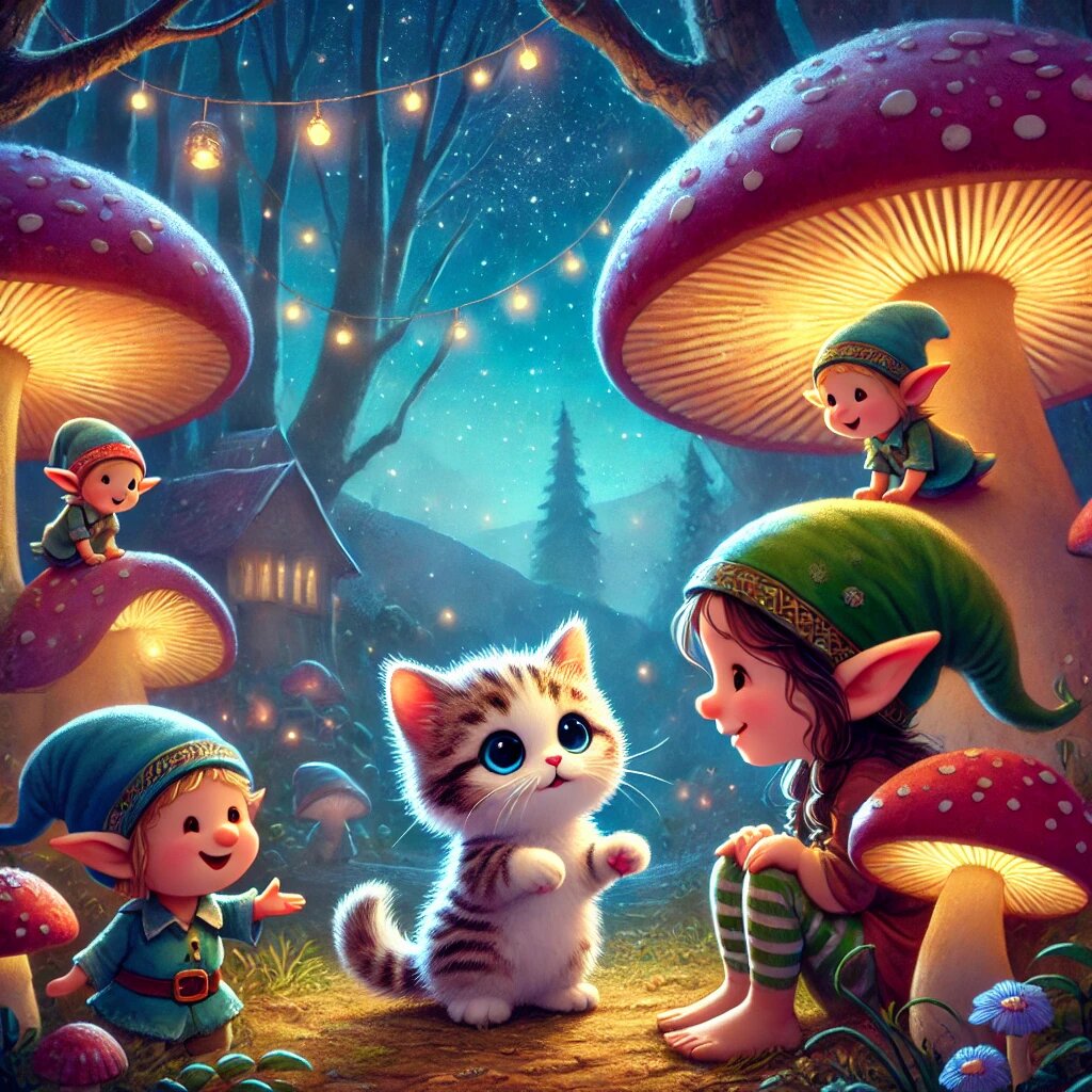 Жили-были кошечка Марта и котёнок Бэнчик. Однажды котёнок гулял в саду и увидел красивую бабочку. Он погнался за ней, и она привела его в волшебный лес. В этом лесу были огромные грибы-дома, в которых жили эльфы. Котёнок очень удивился, но и очень испугался. К Бэнчику подошёл эльф Эшли: - Привет! Как ты попал сюда? -Я бежал за бабочкой. -Будь нашим гостем. Пойдем я тебя познакомлю с нашими жителями. Тем временем кошка Марта потеряла своего сыночка. Он совсем был маленький, глупый котёнок. Она звала его, но он не откликался. Обошла все дома вокруг, его нигде не было. Вернулась домой, ждала его и плакала. А Бэнчику было весело в волшебном лесу, он подружился с эльфами. Играл с ними в догонялки, катал их у себя на спине. Вдруг он посмотрел на небо, там стали появляться звёзды и он вспомнил о маме. Как я вернусь домой? Я больше не увижу маму… Эльф Эшли сказал: -Мы поможем тебе быстро вернуться домой. Не переживай. Эльфы посыпали котёнка волшебной пыльцой. Бэнчик чихнул и оказался дома. Мам