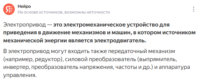 А вот что нам говорит об этом нейросетка Яндекс и ведь она права! Если вы откроете любой из учебников по электроприводу, вы найдете информацию, что электропривод это целая электросистема, которая может включать в себя как электрическую составляющую, так и кусок механической. Вот, например, учебник по электроприводу Дальневосточного федерального университета за авторством Н.М. Марченко что нам говорит: