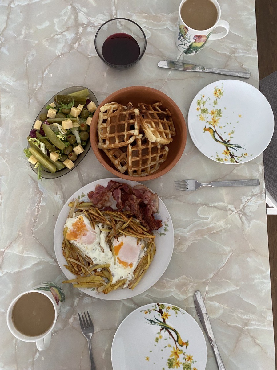 Зажорный На просторах кулинарных блогов называется сие - английский завтрак. Короче "Овсянка, сэр!" - история, к которой много вопросов! Английский завтрак - бекон, яйца, грибы, фасоль, картошка (здесь источники путаются в показаниях, ну да ладно) и всяческие дополнения. У меня представлена часть этого богачества, а именно картошка, яйца и бекон. Рабоче-крестьянские маринованные огурчики отлично аккомпанируют буржуазному брекфасту. Оливки, сыр и салат туда же для ассортимента на витрине. Ну и для неугомонных добавляем вафли и варенье. Yummy!!! Правда после такого завтрака лучше поработать не только мозгами! Вафли Не существует приличных слов, чтобы описать эту вкусность. Нужно только приобрести чудо - машинку, вафли выпекающую. Стоит недорого, а вариант десерта «гость на пороге» всегда в запасе. Опять же, рецептов много: разной сладости, солености, жирности и заглютененности. Мой любимый вариант содержит все вышеперечисленное в количестве неприличном. Но тут дела вкуса. На завтр