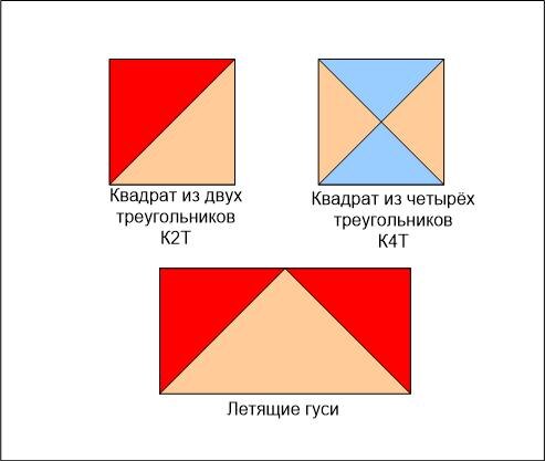 Все, кто увлекается пэчворком, знают, что любое лоскутное изделие состоит из блоков. А каждый блок, если это не просто квадрат из ткани, - из более мелких деталей, которые можно назвать элементарными. Таких деталек в прямых блоках, т.е. в блоках без криволинейных швов, существует не так много. Самые распространённые и самые простые из них - это К2Т, К4Т и "летящие гуси":