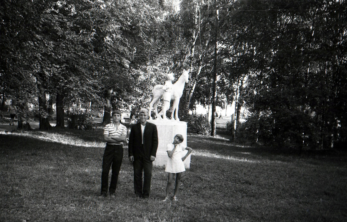 На этом снимке начала 1960-х весёлая компания, которая много месяцев назад уже попадала на радары нашего внимания и тогда они позировали с арбузами у памятника Ленину на улице Мира. И вот теперь мы наблюдаем их скорее всего в тот же день у скульптуры, которая не особо мелькала на старых снимках. А стояла она в Детском парке аккурат напротив входа в церковь Иоанна Предтечи в Рощенье, которая как раз слева за кадром. Сориентироваться на местности нам поможет второй снимок, на котором эту скульптуру я обвёл красной линией.