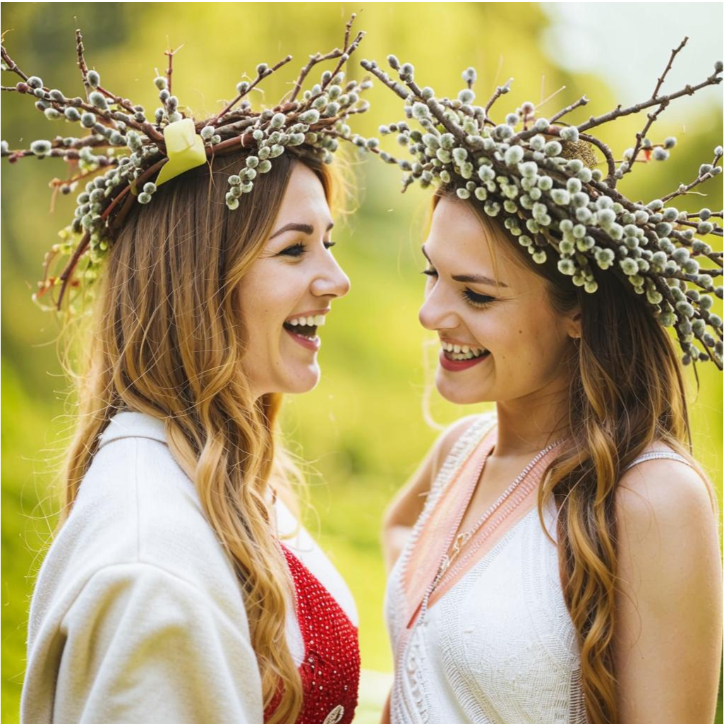 Девушка поймала фрукт налету и благодарно улыбнулась. Откусывая от сочного яблока, она бесцельно бродила по округе, пока не набрела на компанию девушек, плетущих венки из березовых и ивовых прутьев. Они сидели на огромном поваленном дереве, смеялись и разговаривали между собой. Немного посмотрев на их веселье, Полина вздохнула и решила было возвращаться назад, когда к ней обратилась одна из девушек: