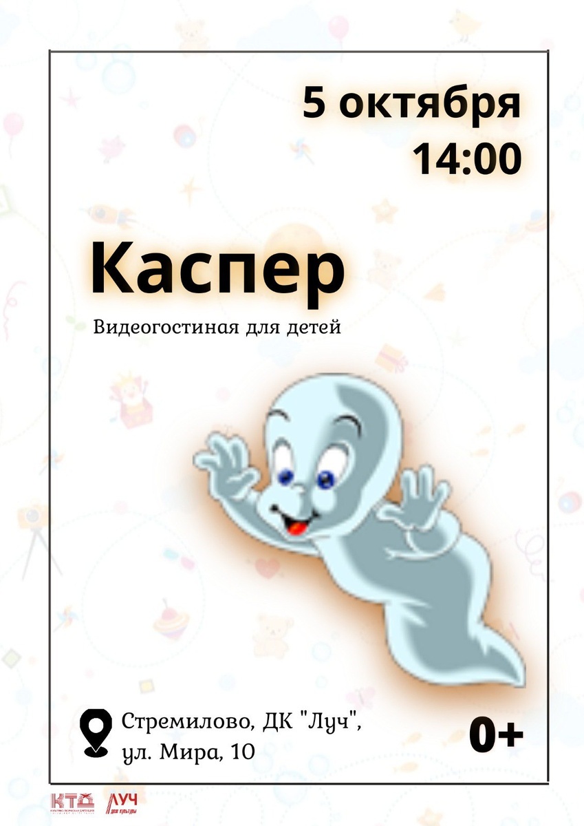 💥 Видеогостиная для детей. «Каспер» Приглашаем жителей и гостей Стремилово в нашу уютную видеогостиную🤗 📶 Категория: Кино 🚫 Возраст: 0+ 📆 05.10.2024 🕕 14:00 🏢 ДК «Луч» 📍 г.о. Чехов, с. Стремилово, ул. Мира, стр.10 🪙 Стоимость билетов - Бесплатно❗️ #ДКЛуч #Стремилово #ГоспабликиМО #ГородскойОкругЧехов