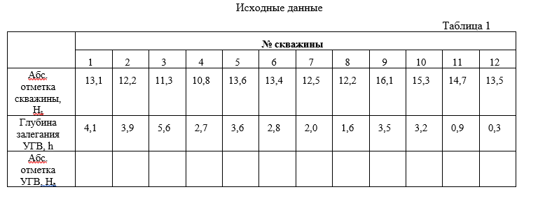 Задание. Построить карту гидроизогипс, пользуясь планом расположения скважин, их абсолютными отметками и глубиной залегания грунтовых вод. Используя исходные данные, построить топографическую основу и карту гидроизогипс масштаба 1:500, расположение 12 скважин в углах квадратной сетки на расстоянии 25 м друг от друга, приняв сечение горизонталей и гидроизогипс через 1 м. На карте выделить участки с глубиной залегания уровня грунтовых вод менее 2 м. В заданном масштабе наносим план расположения скважин, обозначая их кружками диаметром 2 мм. Слева от каждой скважины записывается ее номер, справа в числителе - абсолютная отметка устья, в знаменателе - абсолютная отметка уровня грунтовых вод (УГВ). Абсолютную отметку УГВ в каждой скважине вычисляем как разность между отметкой устья и глубиной залегания УГВ. На= Нз- h, где На - абсолютная отметка УГВ; Нз - абсолютная отметка поверхности земли; h - глубина залегания подземных вод. Пример решения. 1. Для каждой скважины вычисляем На, результат