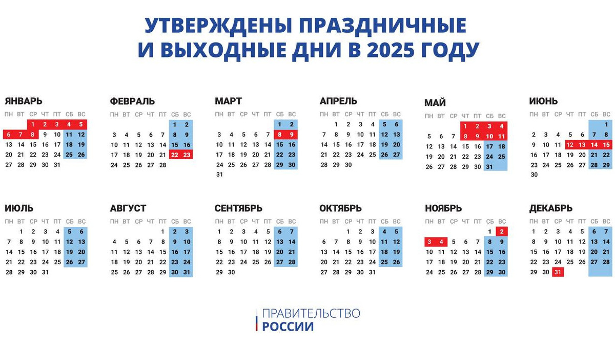 Премьер-министр Михаил Мишустин подписал постановление о праздничных и выходных днях в 2025 году. В официальном телеграм-канале Правительства России 4 октября пояснили, сколько, согласно постановлению, мы будет отдыхать в новогодние каникулы и на майские праздники. В новом году 4 и 5 января выпадают на субботу и воскресенье. Так как это нерабочие праздничные дни, их решено перенести на пятницу 2 мая и среду 31 декабря, соответственно. В итоге, новогодние каникулы продлятся 11 дней – с 29 декабря 2024 года по 8 января 2025 года. А на майских праздниках россияне будут отдыхать с 1 по 4 мая и с 8 по 11 мая. Еще нерабочими будут: 22 и 23 февраля, 8 и 9 марта, с 12 по 15 июня, со 2 по 4 ноября. Фото: телеграм-канал Правительства РФ