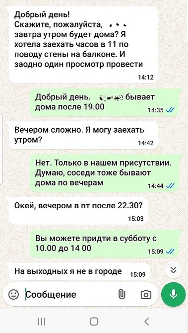 Надо сказать, что мы еще в момент подписания договора обсудили вопрос о том, что арендодательница может приходить в квартиру только в присутствии жильцов во избежание недоразумений разного рода. Естественно, в 11 часов дня студенты учатся и находиться дома не должны. Конечно, я ответила, что можно провести просмотр вечером.