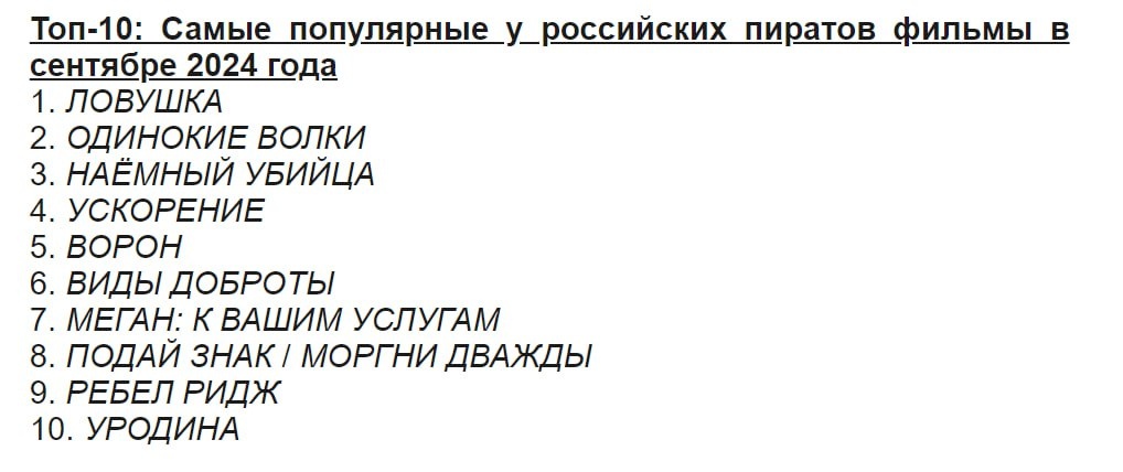 Это топ самых популярных фильмов у «пиратов» в сентябре, по замеру F.A.С.С.T., российского разработчика технологий для борьбы с киберпреступлениями. И опять, как и в топе за полгода, одно «ненаше кино». Только 2 из 10 фильмов - криминальная комедия «Одинокие волки» с Брэдом Питтом и Джорджем Клуни и космическая фантастика «Ускорение» с Кейси Аффлеком и Лоуренсом Фишберном - в легальном прокате в РФ. А Михалков уверяет, что российские зрители прекрасно обходятся без Голливуда. Нет. Не все в нашей стране поклонники «Чебурашек», «Холопов» и попсово снятой русской классики.