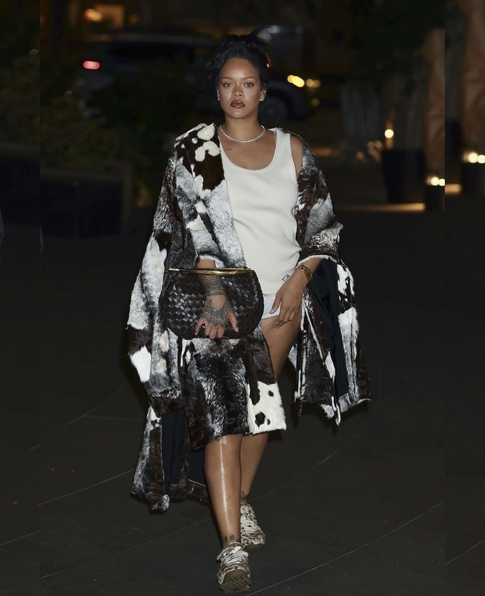 Только недавно папарацци засняли Рианну на улицах Нью-Йорка в майке, трусах и шубе из коровьей кожи, чешущей ногу… … как спустя день перед нами предстает абсолютно элегантная особа, которой Рианна, по-моему, бывает не часто. А повод всему День Рождения ее многолетней любви - ASAP Rocky. Оба были одеты в Bottega Veneta. Кстати, это суперский пакет из «пятерочки» тоже модный аксессуар того же бренда. Рианне очень идет платье, ну а ASAP Rocky-пакет😜