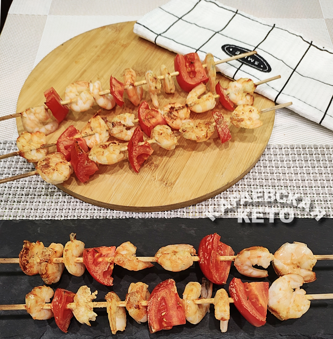 Насадить чередуя креветки и помидор. Посолить и сбрызнуть соком лимона.