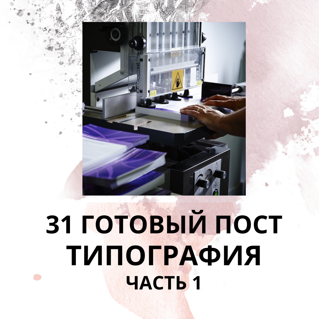 В поисках готовых постов для своих социальных сетей? Мы подготовили для Вас 31 Готовый пост, который Вы сможете использовать в своих социальных сетях для привлечения новых клиентов. Купить посты для "Типографии" можете по ссылке: ТЕМЫ ПОСТОВ: 1.Почему важно выбрать качественную типографию для ваших печатных материалов? 2.Как правильно выбрать бумагу для вашего печатного проекта? 3.5 основных типов печати: как выбрать подходящий для вашего проекта? 4.Как создать дизайн, который будет хорошо выглядеть на любых типографических продуктах? 5.Какой формат и размер лучше выбрать для ваших печатных материалов? 6.Как правильно подготовить файлы для печати в типографии? 7.Какие цвета лучше использовать для печати: CMYK или Pantone? 8.Как типография может помочь в создании уникального брендирования? 9.Что важно учитывать при выборе типографии для печати рекламных материалов? 10.Как выбрать типографию для печати книг и журналов? 11.Какие особенности печати на нестандартных материалах стоит учитыв