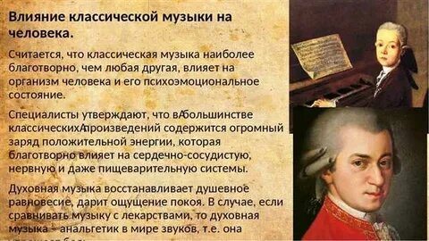 Оказывает следующее положительное влияние: Кроме того, классическая музыка помогает наладить взаимопонимание людей, понять смысл жизни, пробудить в них чувство единения и поддерживает человека в горе и радости.