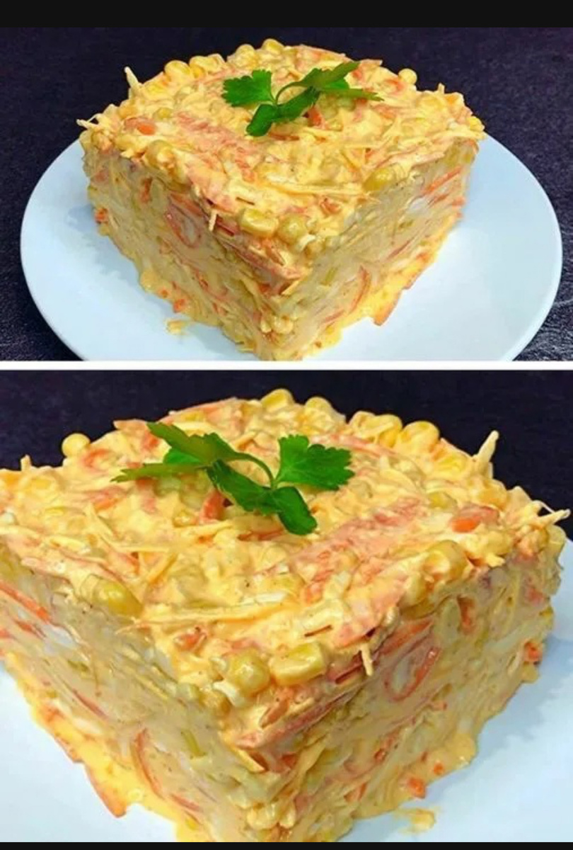 Берем корейскую морковь и делаем салат из ресторана. Нужно просто добавить крабовые палочки Ингредиенты: морковь по-корейски - 150г крабовые палочки - 200г яйца — 2шт плавленные сырки - 1 шт майонез -2 ст.л. Предварительной подготовки салат не требует, сразу собираем его в салатницу. Первым натираем на крупной терке плавленный сыр. Затем также через терку пропускаем отварные яйца. Крабовые палочки режем небольшими брусочками. Добавляем морковь по-корейски, кладем майонез и перемешиваем. Осталось только придать салату форму и он готов к подаче. Салат получился легким, но сытным. Его можно поставить на стол и просто с хлебом.