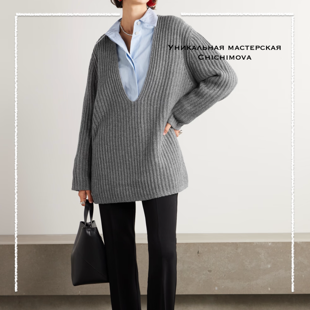 Особенностью свитера является его V-образный вырез, который может показаться слишком драматичным. Чтобы смягчить эффект, рекомендуется надевать свитер поверх рубашки или футболки. Это не только сделает образ более сдержанным, но и добавит многослойности, что актуально в современном стиле.