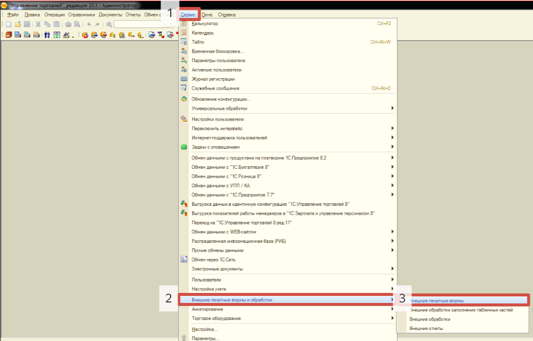 Заходим во вкладку «Сервис», далее выбираем «Внешние печатные формы и обработки», далее – «Внешние печатные формы»: