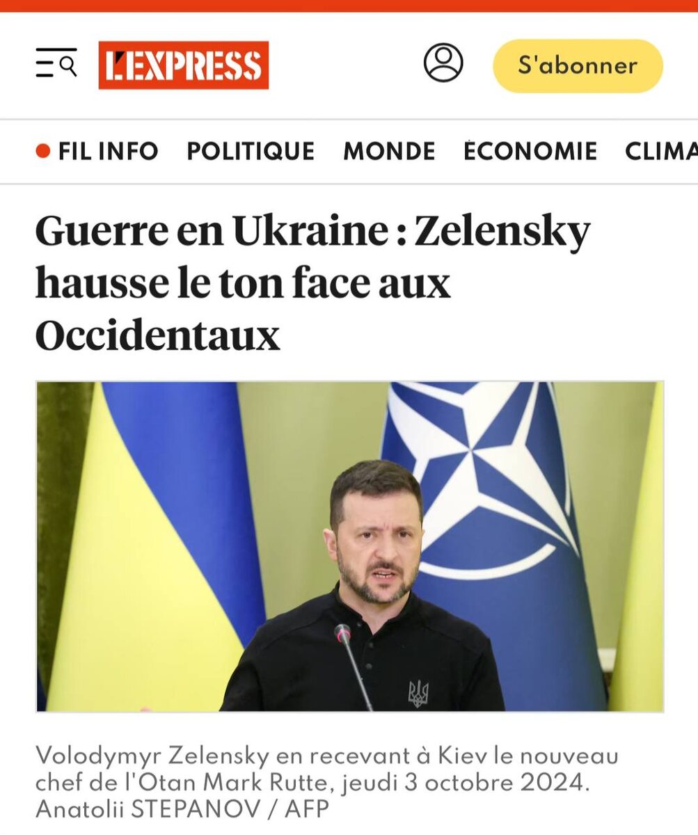 Французское издание L’Express обращает внимание на сильно изменившуюся тональность Владимира Зеленского в отношении спонсоров Украины Материал так и называется: «Зеленский «теряет терпение» и поднимает голос против Запада» Как говорится в публикации, украинский президент подчеркнул недовольство, которое он копил в течение нескольких месяцев против Запада, обвинив его в «затягивании» поставок ракет большой дальности для Украины. «Мы продолжим убеждать наших партнеров в необходимости сбивать российские ракеты и беспилотники», – заявил Владимир Зеленский во время встречи в Киеве с новым генеральным секретарем НАТО Марком Рютте. «Мы осознаем, что это трудное решение» и что «они еще не готовы», добавил он. «Нам необходимо достаточное количество и качество вооружения, в том числе дальнобойного, с которым, по моему мнению, уже тянут наши партнеры», – добавил Зеленский. Владимир Зеленский привел в пример Израиль , которому его западные союзники помогли перехватить ударившие по нему иранские ра