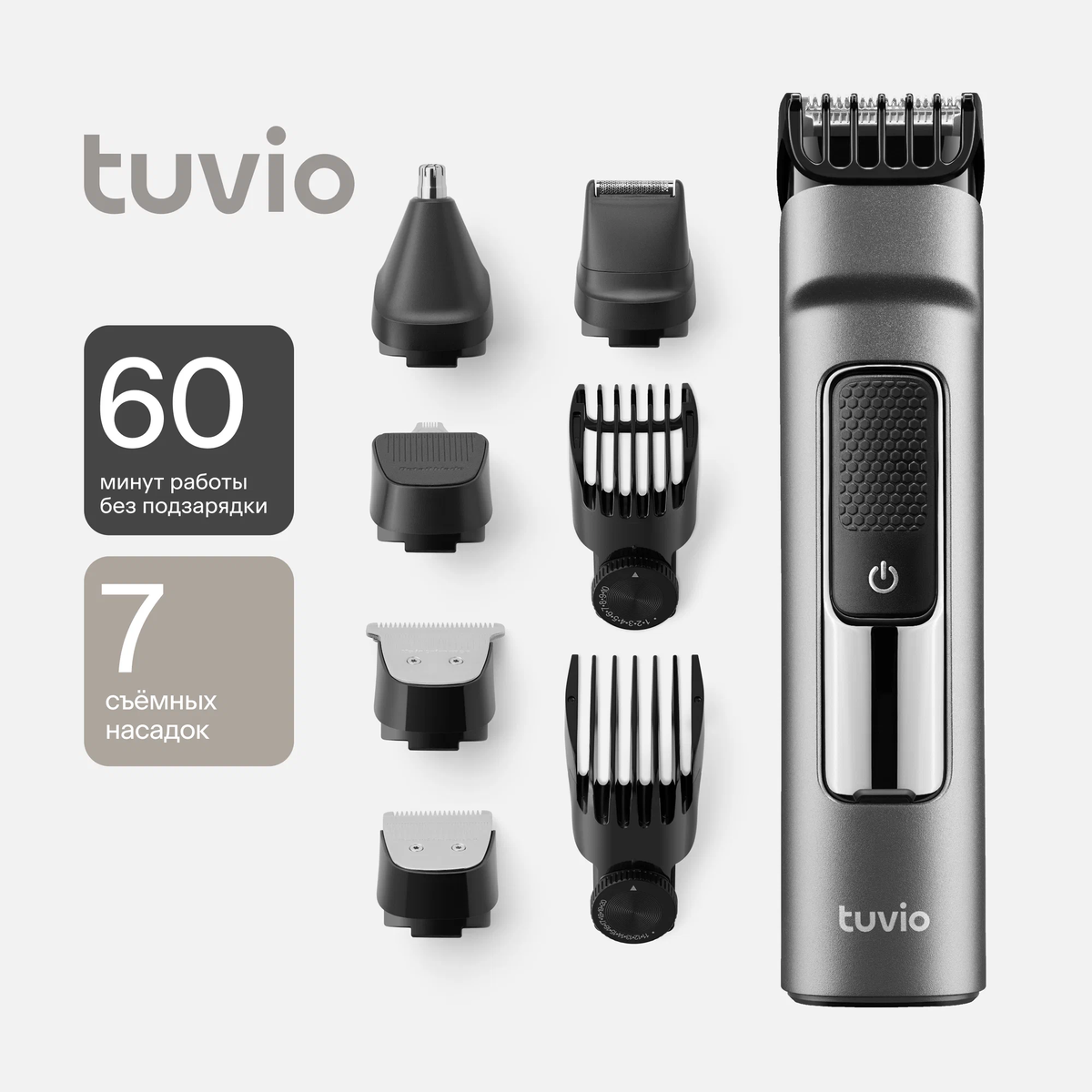 Tuvio — это бренд, который производит удобную бытовую технику. Он был создан компанией Яндекс. Машинка для стрижки Tuvio HC-BGA7G предназначена для удаления и коррекции волос на голове и лице. В комплекте с машинкой идут 7 магнитных насадок, которые подходят для работы с разными типами волос. Есть две телескопические насадки с шагом 1 мм, которые позволяют точно настроить длину среза. Четыре обычные насадки предназначены для стрижки и филировки. Без насадок машинка работает как триммер. Аккумулятор машинки быстро заряжается — всего за два часа — и обеспечивает до 60 минут работы без подзарядки. На дисплее отображается состояние батареи, что позволяет вовремя зарядить машинку. В комплекте с машинкой идут зарядный кабель USB Type-C, крышка и сумка для удобного хранения и транспортировки.