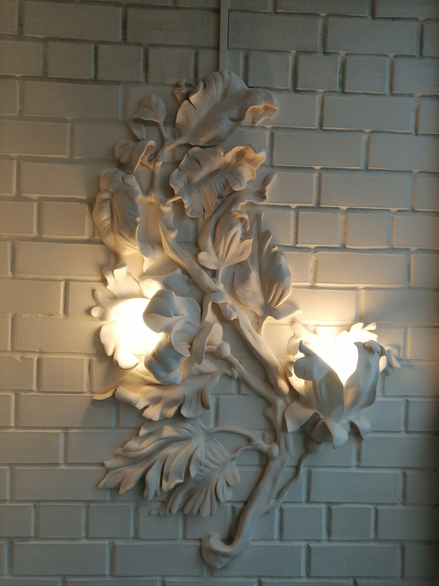 В моей практике это был единственный раз, когда я создавала барельеф на балконе. Интересная идея для интересной молодой женщины. Она хотела создать уникальный светильник из гипса, в виде цветущей ветви. Вот в таком виде была стена, когда я начала работу с эскизами. Когда форма была найдена, я наметила расположение ламп на стене, и электрик провёл проводку с патронами. Площадь работы совсем небольшая, я делала её быстро. Фото ниже и выше- результат работы одного дня. Для крепкой фиксации со стеной я попросила завинтить в стену несколько саморезов. К сожалению, на фото их уже не видно. скотчем я зафиксировала некоторые листья, чтобы лони высохли в нужном положении. Листья армированы сеткой. После полного высыхания они обрели крепость и устойчивость к воздействиям. Инструменты, как всегда,мастихины и кисть. Любимая форма- ветви, листья и цветы. Создавать это легко и приятно. Фото выше- готовая форма, на просушке. Заказчица захотела две большие декоративные лампы. Я раньше выбирала толь