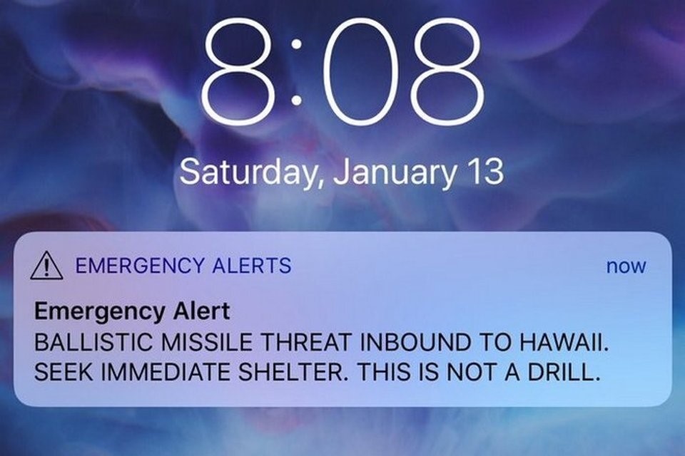 Ранним утром 13 января в 8.07 утра на райском острове Гавайи прозвучал сигнал тревоги чрезвычайного положения. Сигнал гласил: «Угроза баллистической ракеты нависла над Гавайями. Немедленно найдите убежище. Это не учения». Одновременно местным жителям пришли смс-оповещения следующего содержания: