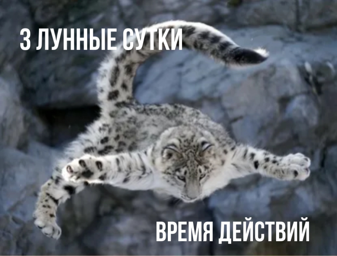 Изображением трехдневного лунного цикла служит Леопард, или Снежный Барс, собирающийся в прыжок. Это время для очищения Астрального тела. Прошли дни, посвященные Гекате (это были дни новолуния, а также первые и вторые после него), и на небе появился новый лунный месяц. В Википедии этот период называется Неоменией, что в переводе с древнегреческого означает «новая Луна». Это первое появление Луны на небе после новолуния, когда она выглядит как узкий серп. Силы, накопленные на протяжении этих лунных дней, достигли большой силы и теперь способны оказать поддержку нашим начинаниям. Время пришло, чтобы вложить в нас все задумки и планы, которые мы так долго вынашивали в себе или которые уже давно зародились в нас. Всё, что до этого раздумывалось и созревало внутри нас, теперь требует воплощения в реальность. Настает период активного действия, усилий, борьбы с астральными страхами, переживаниями, негативными мыслями, агрессией, леностью и прочими внутренними сопротивлениями. В этот пери